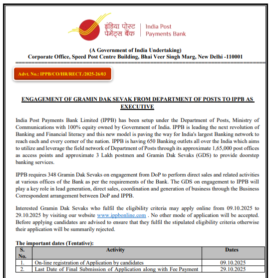 IPPB GDS Recruitment 2025: India Post Payments Bank (IPPB) announces 348 Gramin Dak Sevak (GDS) Executive vacancies in 2025. The India Post Payments Bank (IPPB) has announced a golden opportunity for candidates with a Bachelor’s degree. The official IPPB GDS Vacancy 2025 notification is out, inviting applications to fill 348 Executive posts across multiple states in India. This recruitment is especially for Gramin Dak Sevaks working with the Department of Posts who wish to join IPPB as Executives. With online applications open at ippbonline.com, this is a chance to secure a promising career with a monthly pay of ₹30,000.