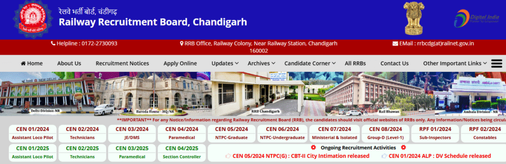- Visit the official regional Railway Recruitment Board website (e.g., rrbcdg.gov.in or specific zonal RRB websites).