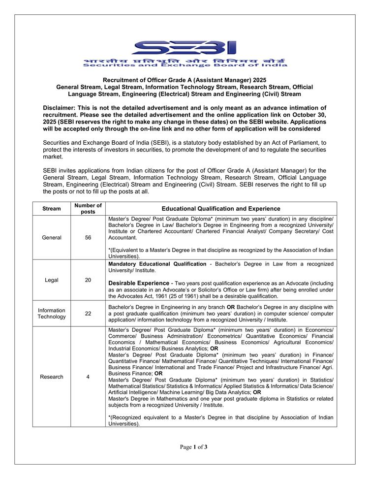 The Securities and Exchange Board of India (SEBI) has announced the much-awaited SEBI Grade A Notification 2025 for 110 Assistant Manager (Officer Grade A) positions across diverse streams such as General, Legal, Information Technology, Research, Official Language, Electrical, and Civil Engineering. This SEBI Grade A Recruitment 2025 offers an excellent opportunity for talented graduates and postgraduates to join India’s apex capital market regulator and play a key role in shaping the securities market ecosystem.